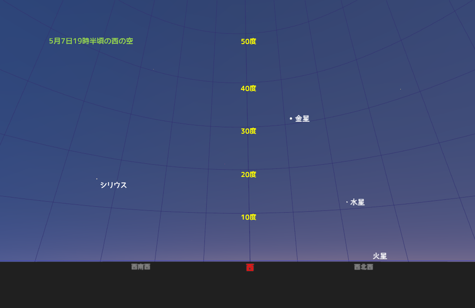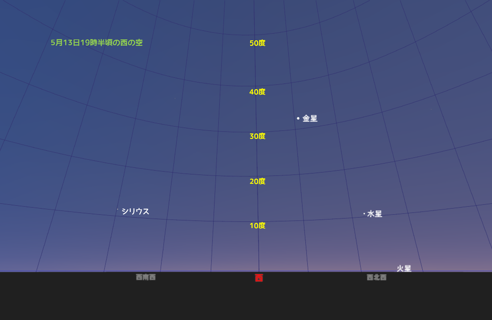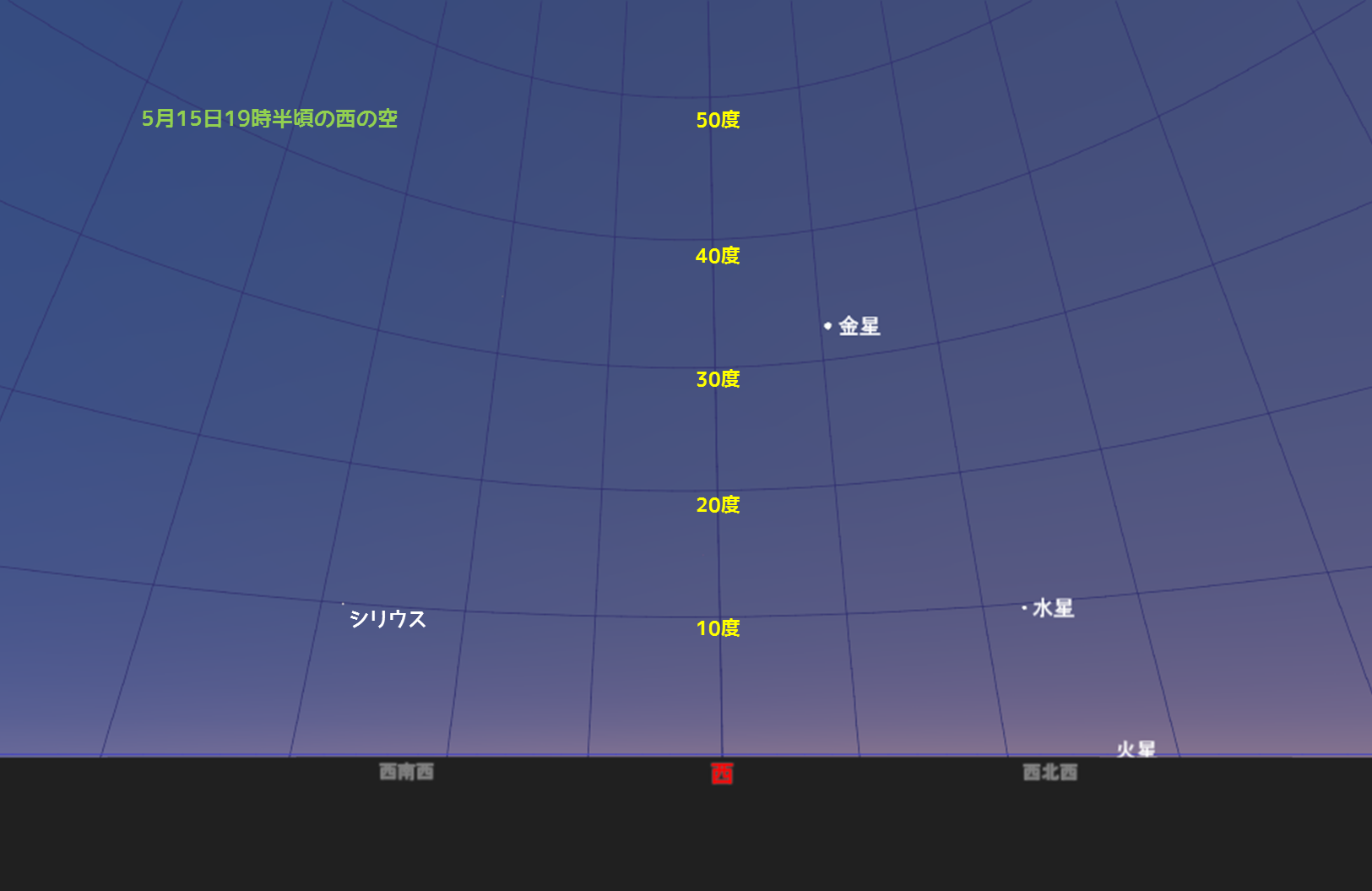 5月1日から15日、19時半頃の西の空、 水星はどの位置に見えるでしょうか?? 画像をクリックすると拡大します。 ※星図はAstroArts社のステラナビゲータver.9を用いて作成しています。 腕を伸ばしたときに、親指の付け根から先端までが約10度です。 5月1日 5月3日 5月5日 5月7日 5月9日 5月11日 5月13日 5月15日