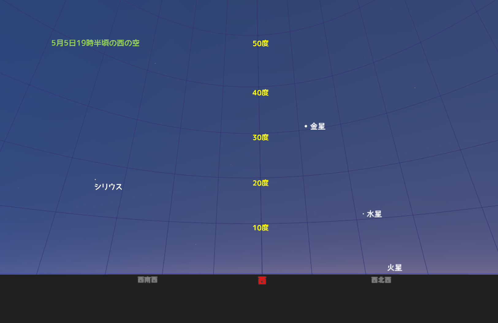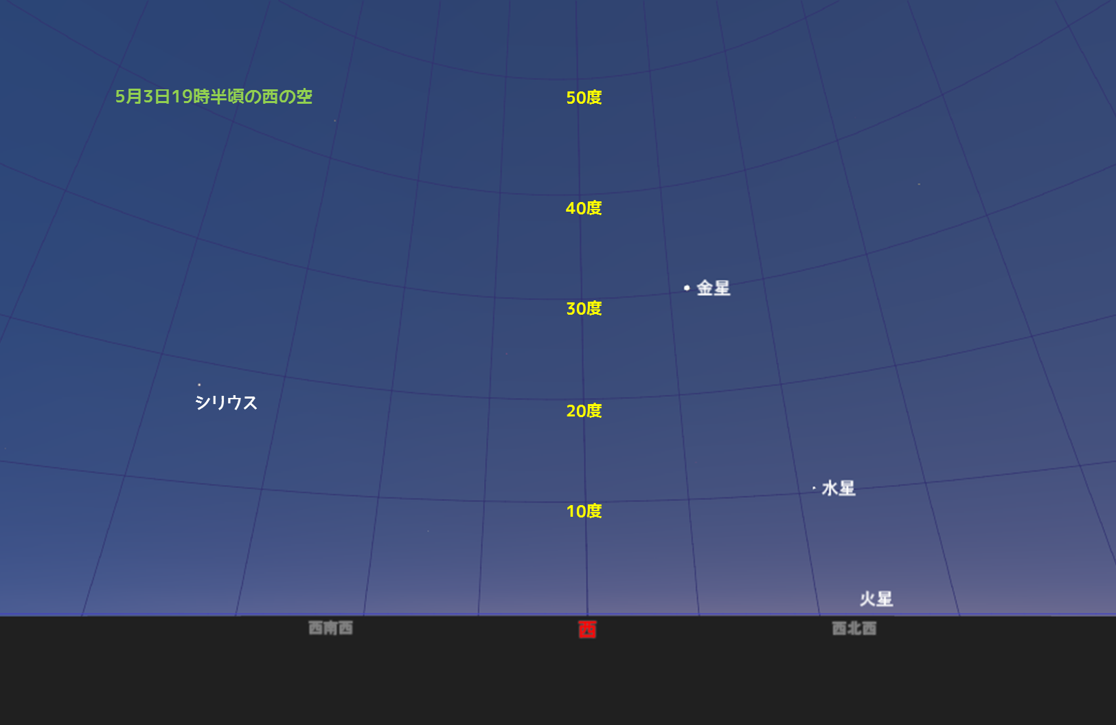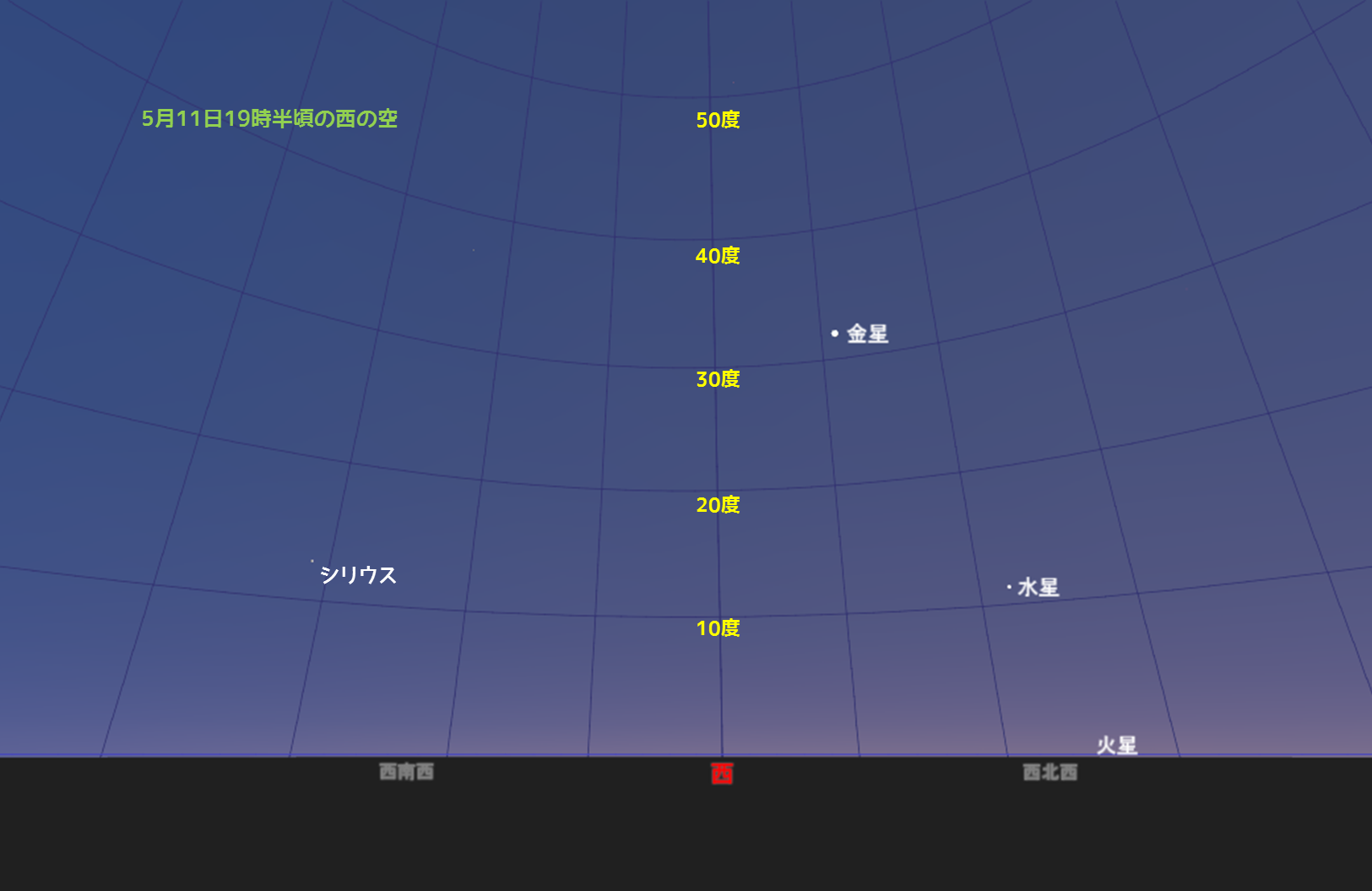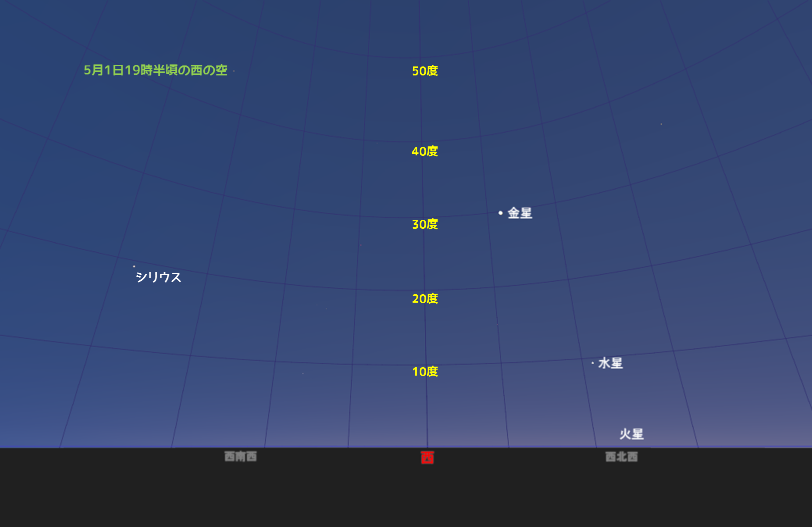 5月1日から15日、19時半頃の西の空、 水星はどの位置に見えるでしょうか?? 画像をクリックすると拡大します。 ※星図はAstroArts社のステラナビゲータver.9を用いて作成しています。 腕を伸ばしたときに、親指の付け根から先端までが約10度です。 5月1日 5月3日 5月5日 5月7日 5月9日 5月11日 5月13日 5月15日